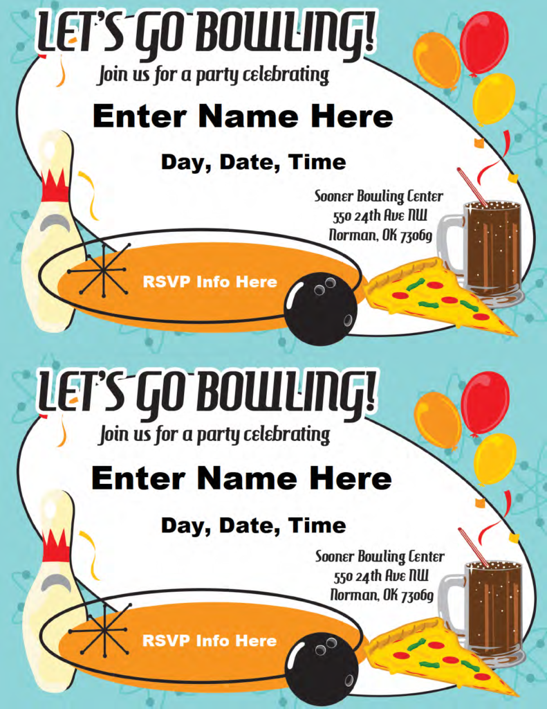 A. Our Bowling Center provides invitations and they may be picked up at the front desk during regular business hours. In fact, if you bring us your invite list, we will even mail them out for you!